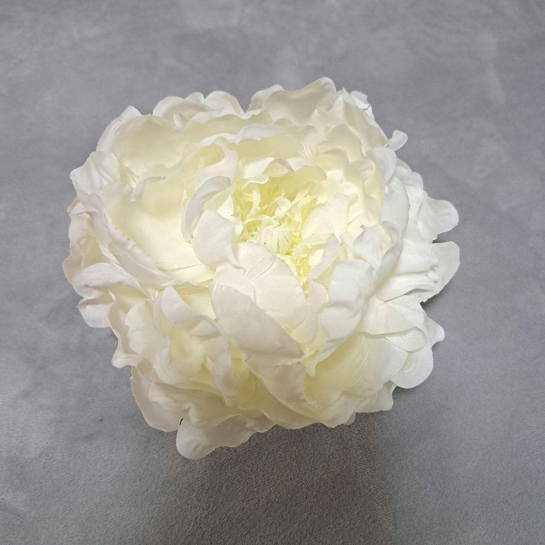 ホワイトの造花ヘアアクセサリー、ボックス付きで収納していました。 ブーケのアーティストの方にオーダーメイドで作ってもらったもので、1万円ほどしました。髪につけた時に安いものより大きくキレイに花びらが広がります。 ★箱なし、宅急便コンパクトの発送で良ければ1000円値引きします。 浴衣にあわせたり、ウェディングでも使えるかと思います。 純白ではなく、少し黄色みがかった白で日本人に肌なじみがいいものです。 - 色: ホワイト - デザイン: 花のクリップ - 付属品: ボックス付き 直径 : 約14cm ★撮影のために3回使用したのみ。 ご覧いただきありがとうございます。