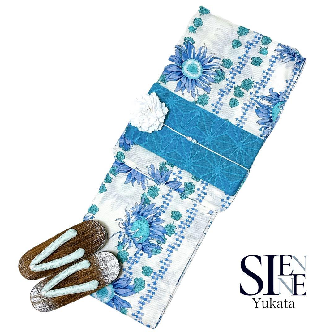 浴衣ジェンヌ 浴衣5点セット 白 ブルーの向日葵 浴衣 半幅帯 ゆかた着物・浴衣